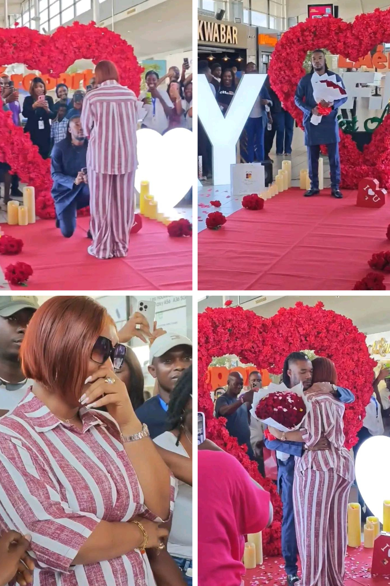 À sa descente, une surprise de taille l’attendait. Serey Dié, son compagnon de longue date, avait tout prévu. Pas un détail n’avait été laissé au hasard. L’ambiance, la mise en scène, la présence… tout était pensé pour créer un moment unique, inoubliable. Devant les regards surpris des passants et l’émotion palpable dans l’air, il a choisi cet instant précis pour faire sa demande. Un choix audacieux, mais profondément symbolique : un lieu de passage, de retrouvailles, de départs… et désormais, de promesse.